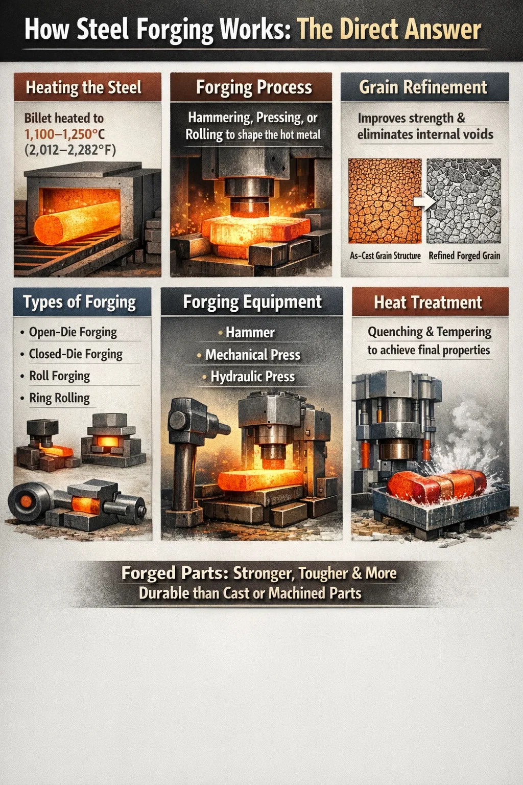 실제적으로 강철 빌렛 또는 잉곳은 다음 온도 사이에서 가열됩니다. 1,100°C 및 1,250°C 가장 일반적인 산업 방법인 열간 단조의 경우 (2,012°F ~ 2,282°F)를 프레스나 해머 아래에 놓아 원하는 모양으로 변형시킵니다. 그런 다음 성형된 부품은 제어된 조건에서 냉각되고 기계 가공, 열처리 또는 표면 처리를 통해 마무리됩니다.