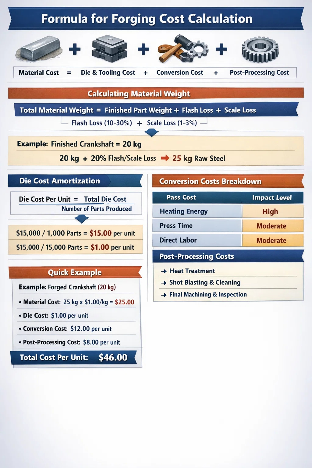 총 비용 계산 강철 단조 네 가지 기본 원칙을 요약하는 작업이 포함됩니다. 재료비 (순 중량 + 플래시 손실), 툴링/다이 비용 (생산 기간 동안 상각됨) 전환 비용 (에너지, 노동 및 기계 간접비) 및 후처리 비용 (열처리 및 가공). 표준 중형 기어의 경우 일반적으로 재료가 전체 단가의 40~50%를 차지하며, 툴링이 가장 큰 초기 변수입니다.
