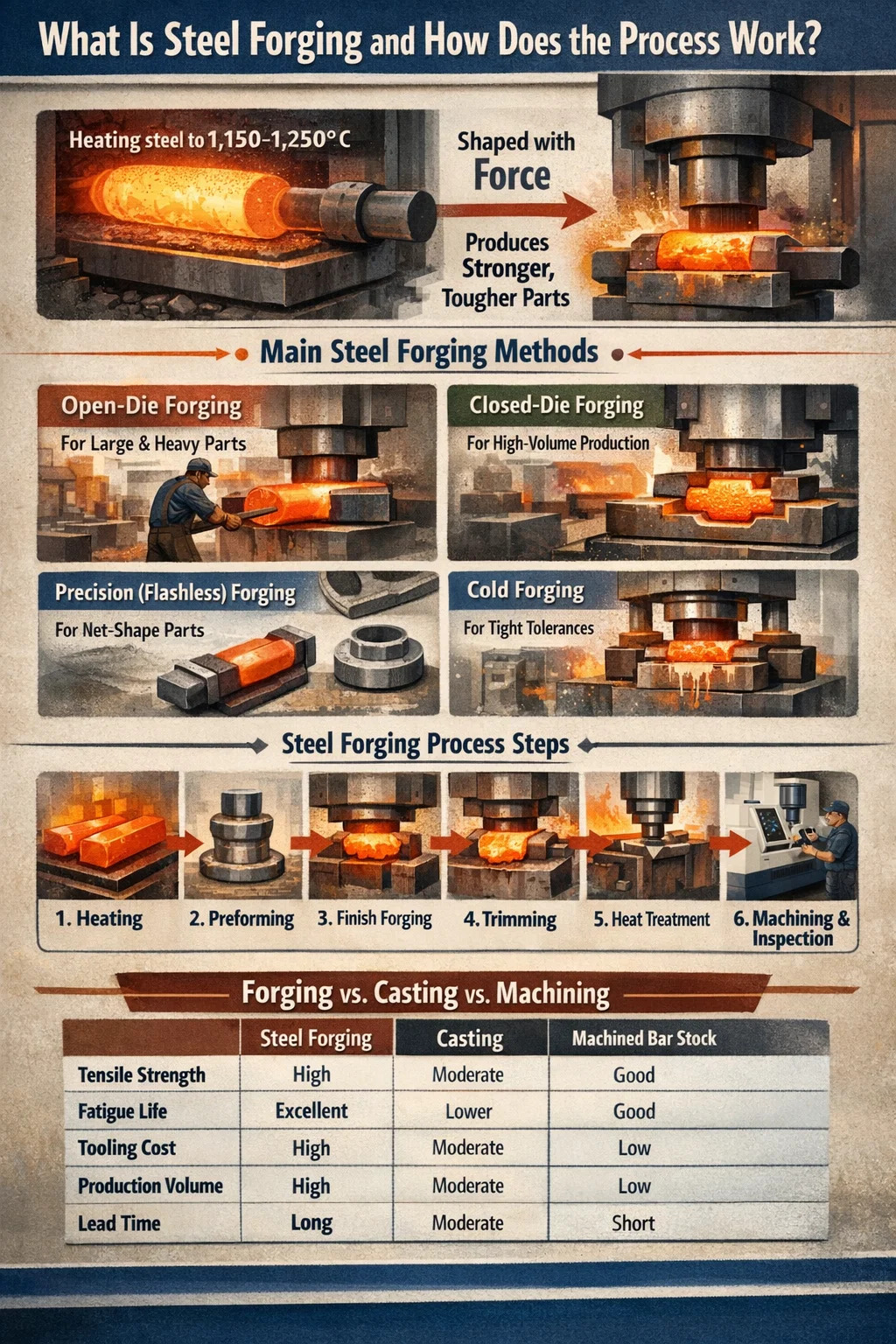 각각의 강철 단조 방법은 치수 공차, 표면 상태 및 툴링 비용이 다른 부품을 생산합니다. 잘못 선택하면 비용이 추가되거나, 리드 타임이 연장되거나, 과도한 2차 가공이 필요한 부품이 생성됩니다.