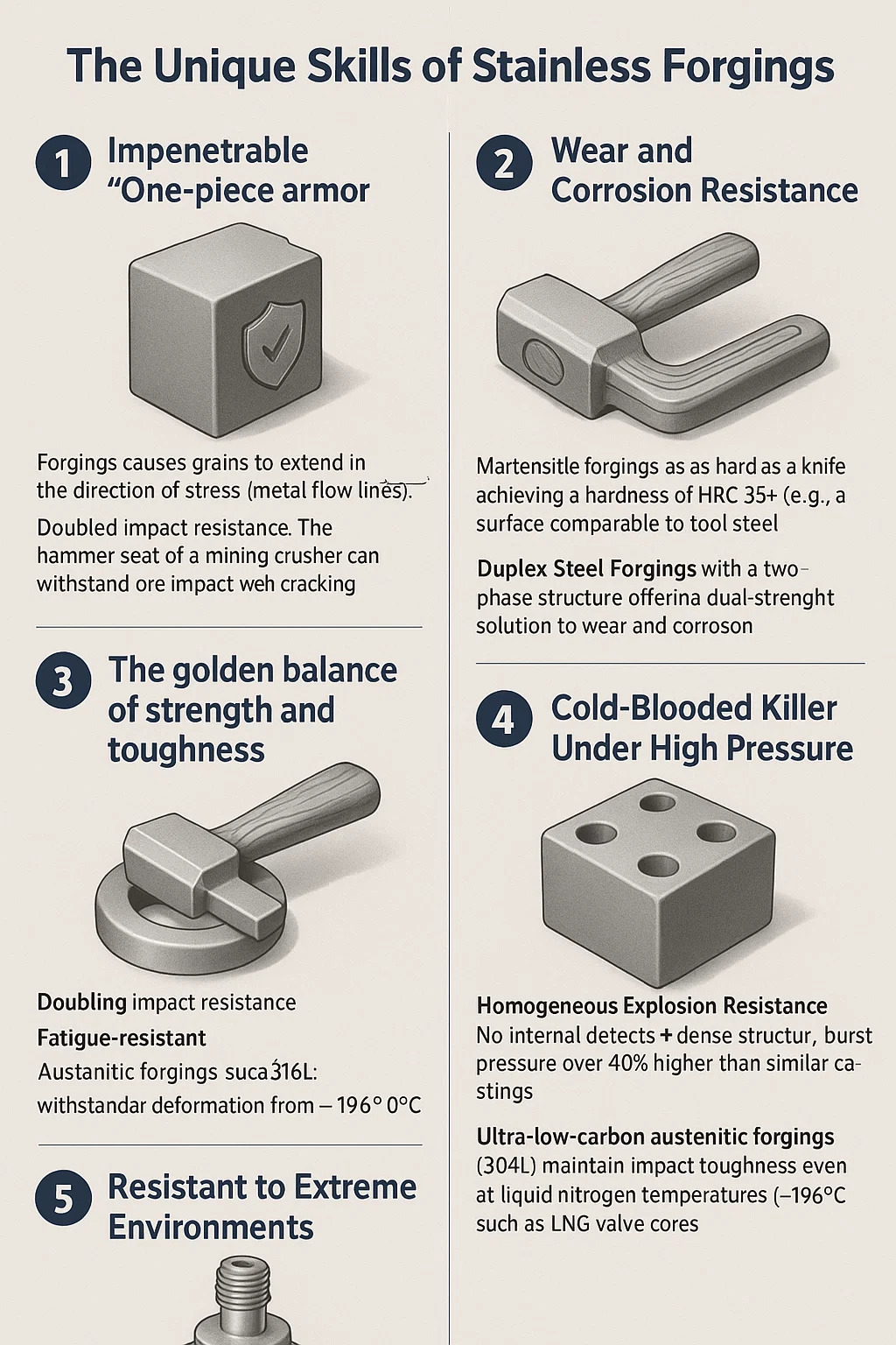 강성과 유연성 모두: 오스테나이트 단조품(예: 316L)은 -196°C ~ 800°C의 변형을 견딜 수 있을 정도로 매우 견고합니다.