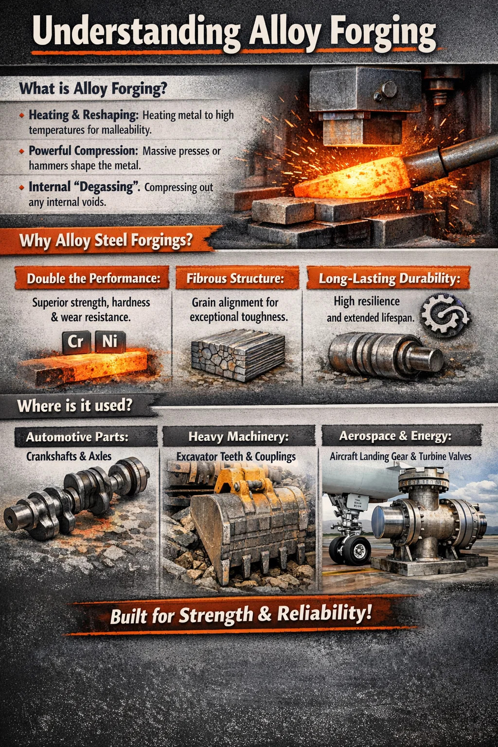 중장비: 암석과 직접 접촉하는 굴삭기 및 불도저의 "치아"와 조인트에는 합금강 재료가 사용되는 경우가 많습니다. 항공우주 및 에너지: 항공기 랜딩 기어 및 발전소의 대형 밸브와 같이 중요하고 열악한 환경에서는 합금 단조품이 거의 독점적으로 사용됩니다.